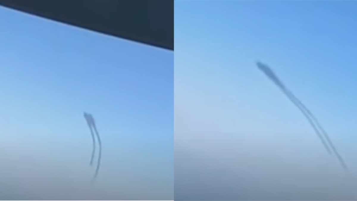 It was reportedly shot last year but only got posted recently. The video shows two long, dark objects in the sky next to the plane. They have tails or tentacles that extend behind them, and at one they point seem to merge into one figure. The entity then flips around in the air before the video ends.